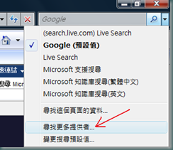 step.1 請由IE7右上角的搜尋方塊的下拉選單中, 選擇"尋找更多提供者"